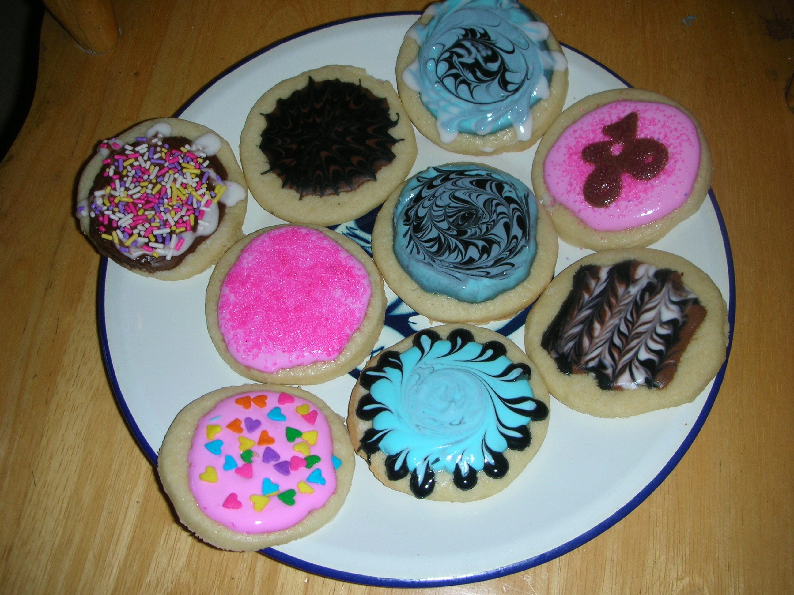 Holiday baking has begun! I took a few dozen decorated cookies to our family Thanksgiving party. The idea for the marbling effect came from SweetAmbsCookies. Her cookies are a little more elegant than mine, possibly because she uses all that professional decorating equipment rather some clunky pastry tips that I bought at a yard sale last summer. I found some cute sprinkles at Safeway that were great for covering up my mistakes. These cookies went over like gangbusters at Thanksgiving. I’ve got two more parties and two more family gatherings to go this season, so plenty more cookie opportunities.