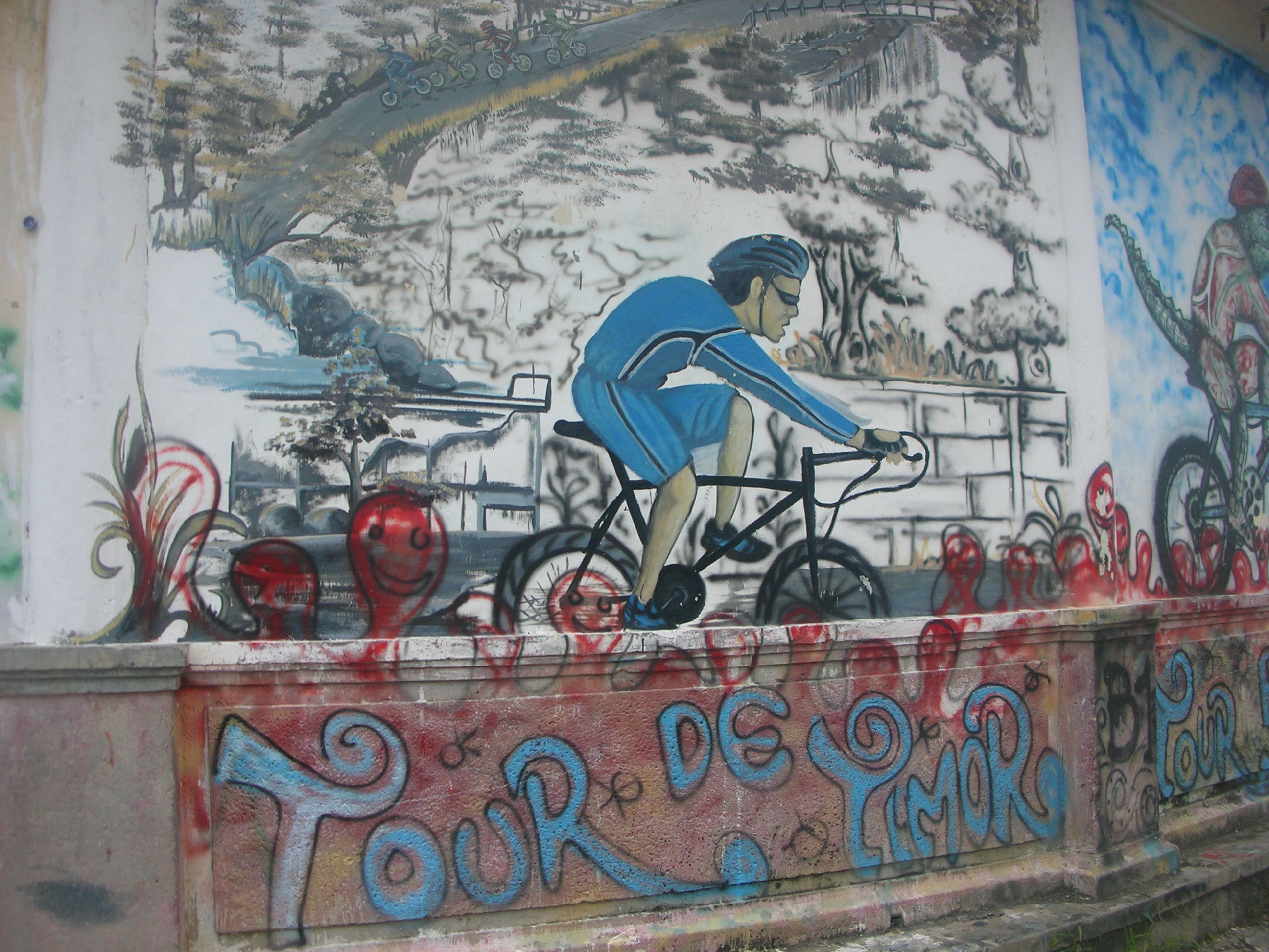When I toured East Timor in 2010, I had just missed the annual Tour de Timor mountain bike race. I did get to see the murals painted around the island. And the tee shirts they must have tossed out to the crowds. I’m not sure the race is still going on. One write-up I read for the 2013 race said the organization was poorly managed. The Timorese cyclists were protesting their lack of support. There was no beer at the finish line. Still, if someone was looking for a bicycle race in a place like no other, this would be that race.