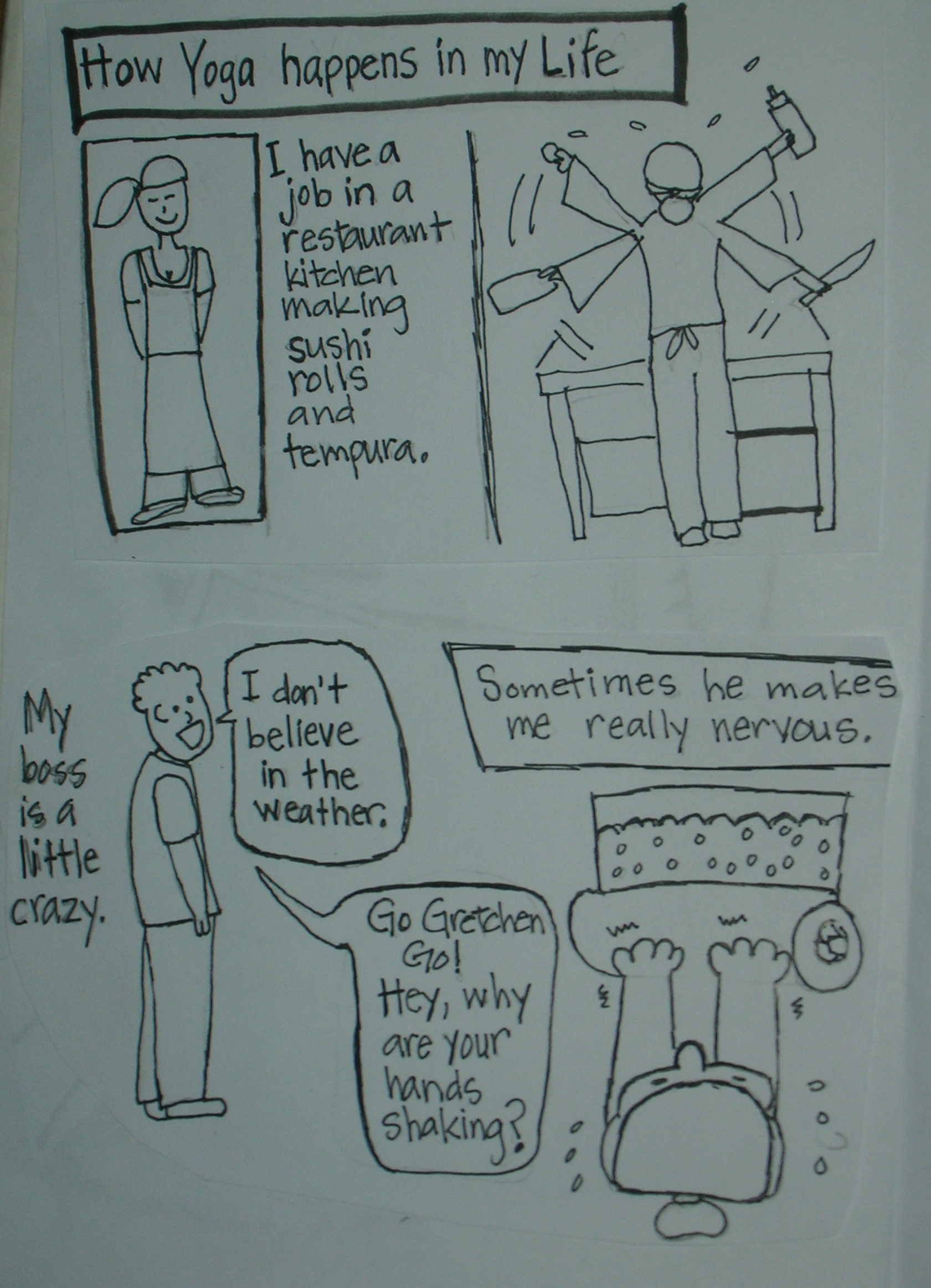 Uncategorized Yoga Comic I took a yoga class for PE last semester. For the final paper, I turned in this comic strip about my relationship with yoga. Share this: Click to share on X (Opens in new window) X Click to share on Facebook (Opens in new window) Facebook Like Loading... Published by Gretchen Howell View all posts by Gretchen Howell