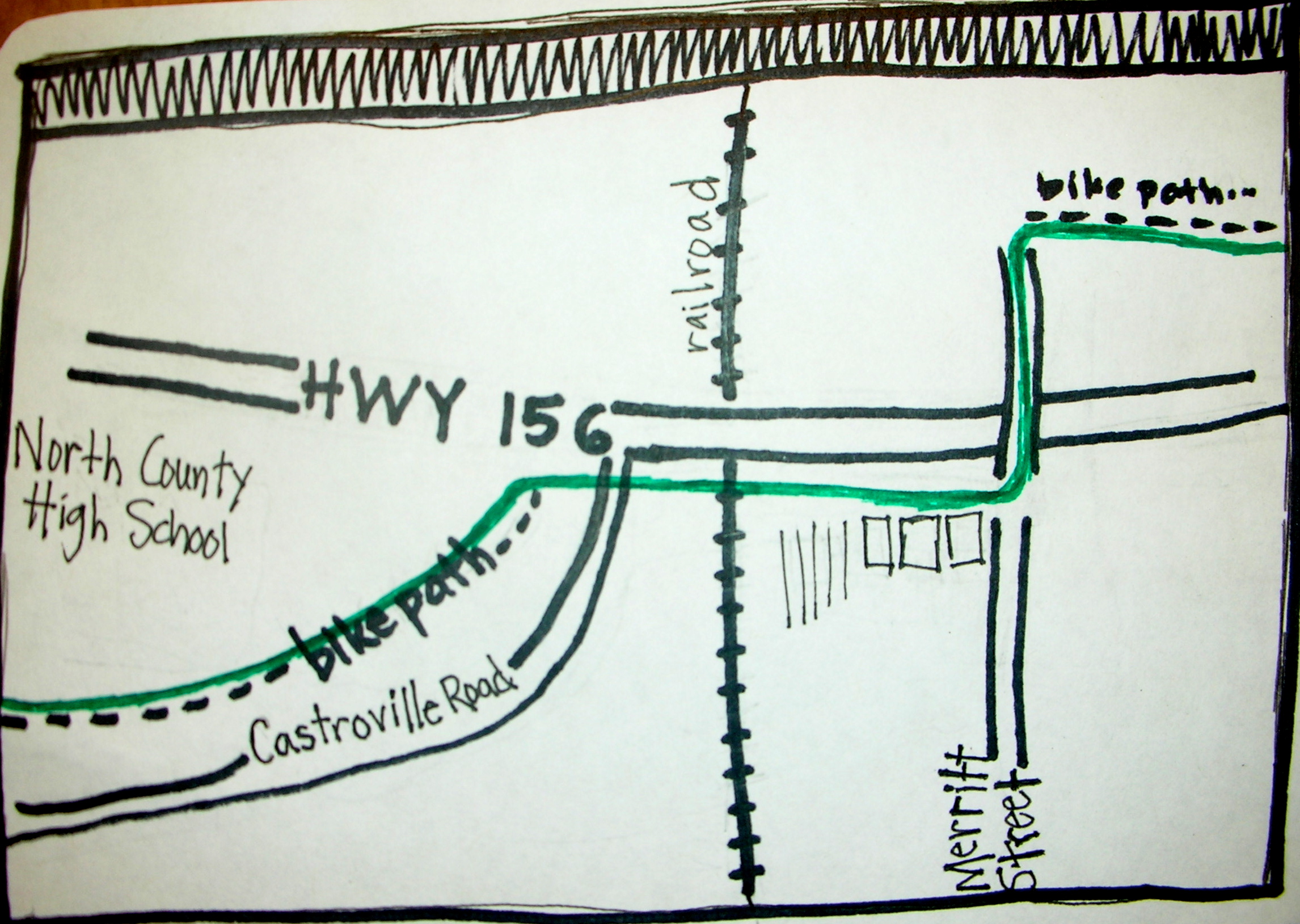 Near North County High, I came to the intersection where the Pacific Coast bike route leads riders up onto a busy highway for a short stretch into Castroville. It’s a dangerous place to ride so I decided to try to skip it by riding through the strawberry fields. I had to lift the bike over the railroad tracks, but besides that, it’s a straight shot to rejoin the regular route at Merritt Street.