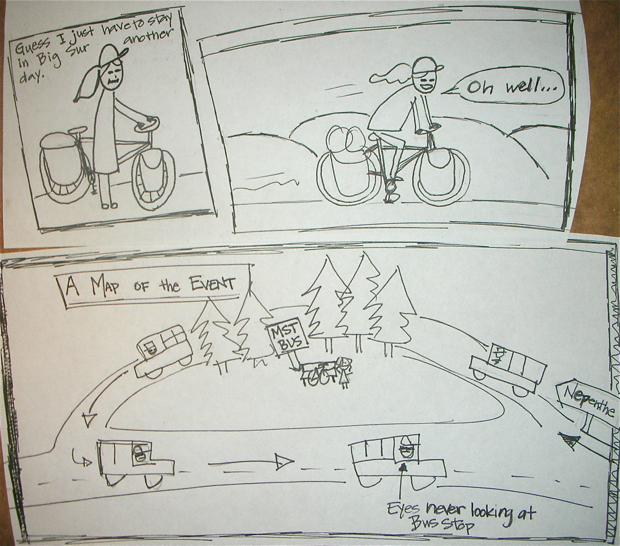 The next day was supposed to be spent taking the bus back to Gilroy. I had a plan. I had printouts of the necessary bus schedules. There was only one particular combination of buses that would get me home in time and it all relied on me catching the bus that morning at Nepenthe. It was only a 20 minute ride from the campground. I was totally early and packed down, ready to load my bike on that bus.