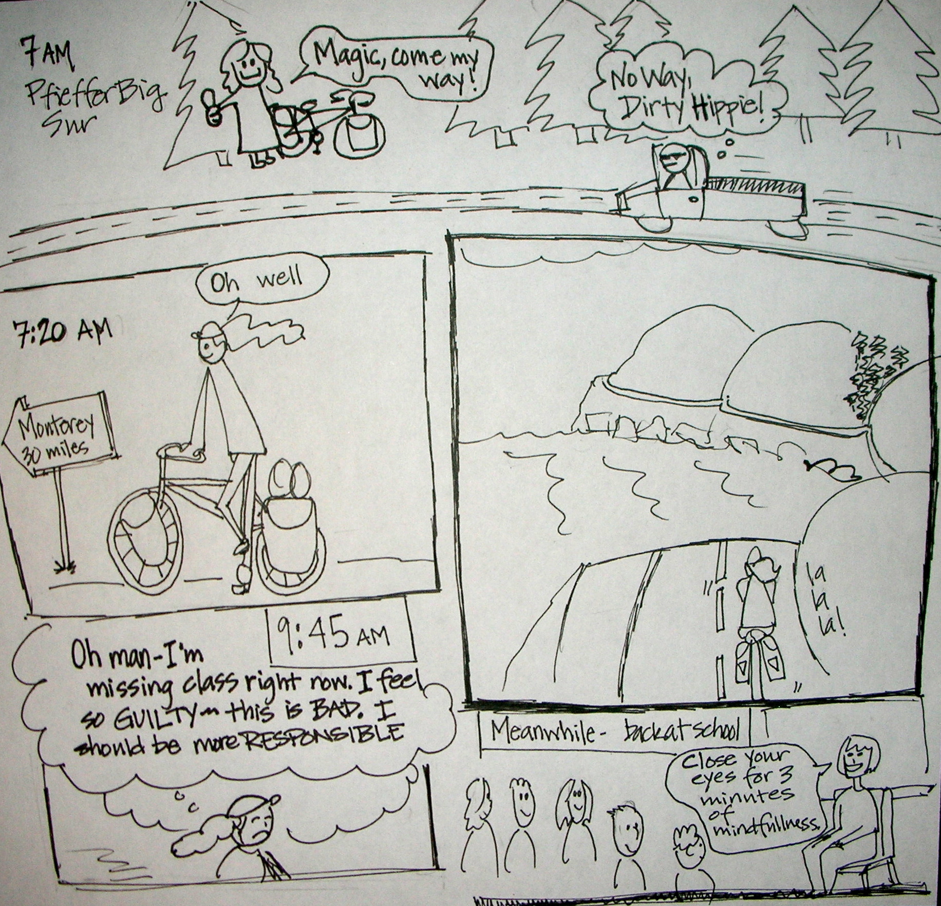 I went to Henry Miller Library and stomped around some paths and considered my options. I could try to ride back to Monterey today, but then I’d be battling traffic from the skinny side of the road. I could try to catch the later bus and then call my brother to come pick me up in Monterey. Which he would probably do, but it would be a hassle for him. Or… I could just stay another night in Big Sur and then ride back to Monterey tomorrow morning, nice and early when traffic is still light, and catch the Gilroy bus in the afternoon. That was the funnest option, but I would miss a day of school. And work. And a deadline for a project. Cellphone reception is tricky on the coast, but I managed to get a hold of my brother so he could turn in my project and make my apologies. Then I went back to Pfieffer and went hiking in beautiful forests for the rest of the afternoon.