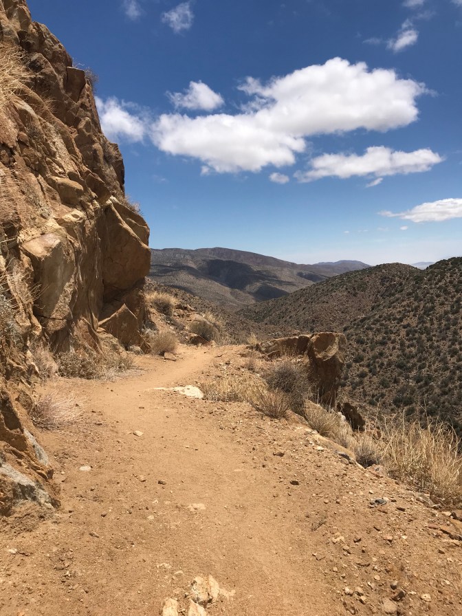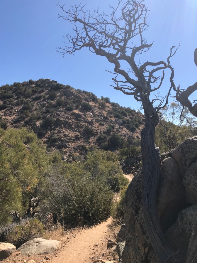 I hiked for an hour and took a break and did that over and over. By 10 I hadn’t made my ten miles, not even close, but I had made 6 miles. I listened to podcasts to distract myself from my whiny body parts. Around 11:30, I couldn’t keep up with my hour goals anymore. It was time for lunch. I wandered off the path down a dry stream and found a soft bit of sand under some patchy shade. I ate tuna and tortillas. Then I fell into a perfect post-lunch coma.
