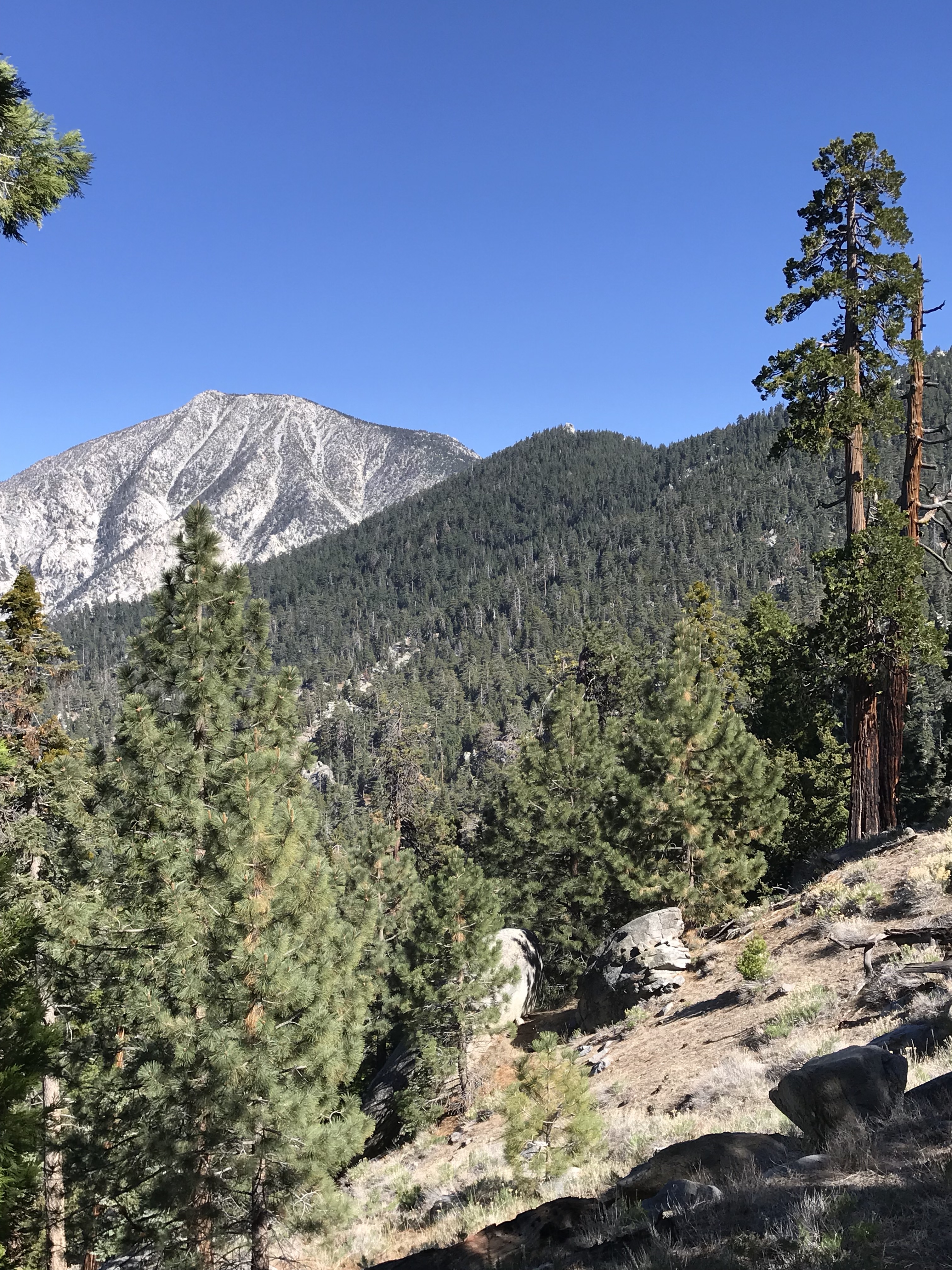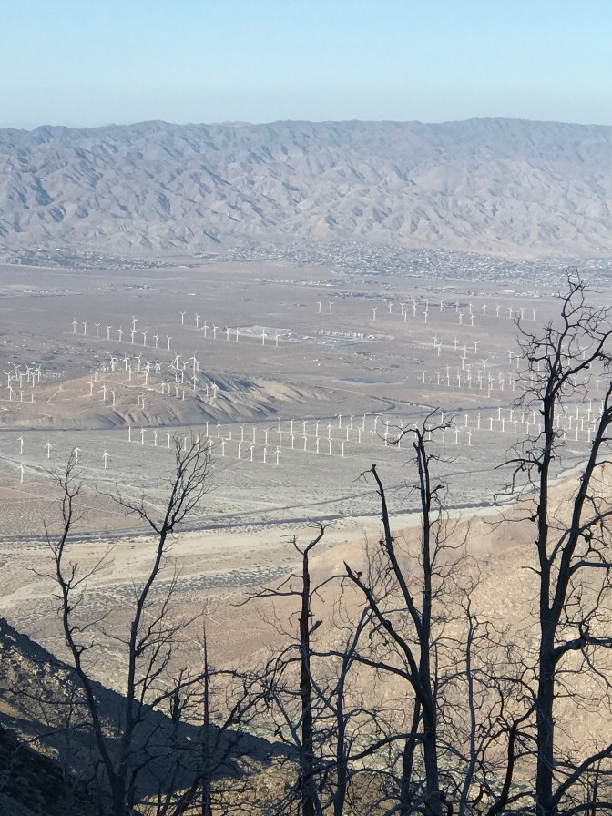 It seemed like there was one turn where the mountain suddenly went from forest back to desert. It was all sand and pokey brush again. No more dinosaur trees. The lizards were suddenly larger. And leapier. Spread out below was the desert pass between San Bernardino and Palm Springs. Huge white windmills gridded the the desert floor. Beyond lay another set of mountains. It’s an intimidating path to follow. Cross that windy desert, climb that next mountain, and the one after that, and the one after that.