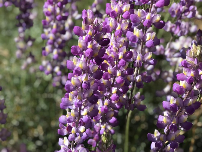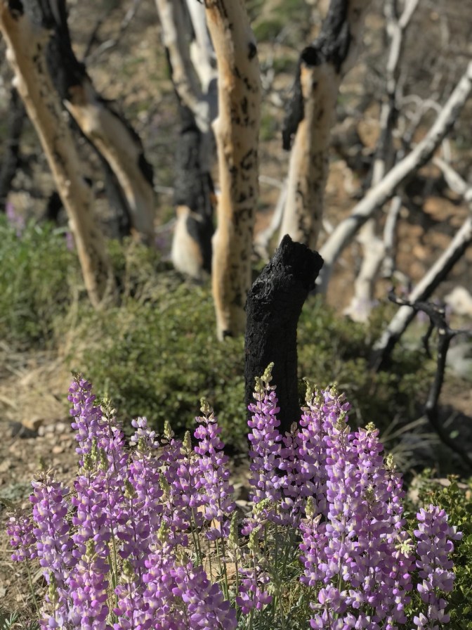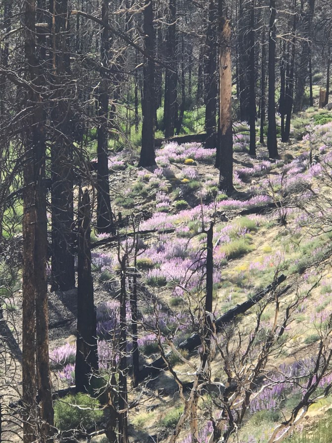 I entered a section that had been burned in a fire years ago. Wild flowers seem to be an important part of the regeneration cycle, especially the lupines. I love lupines. The drifts of purple flowers looked exquisite next to the burned black trees. Lupines are legumes, so they fix nitrogen into the soil.