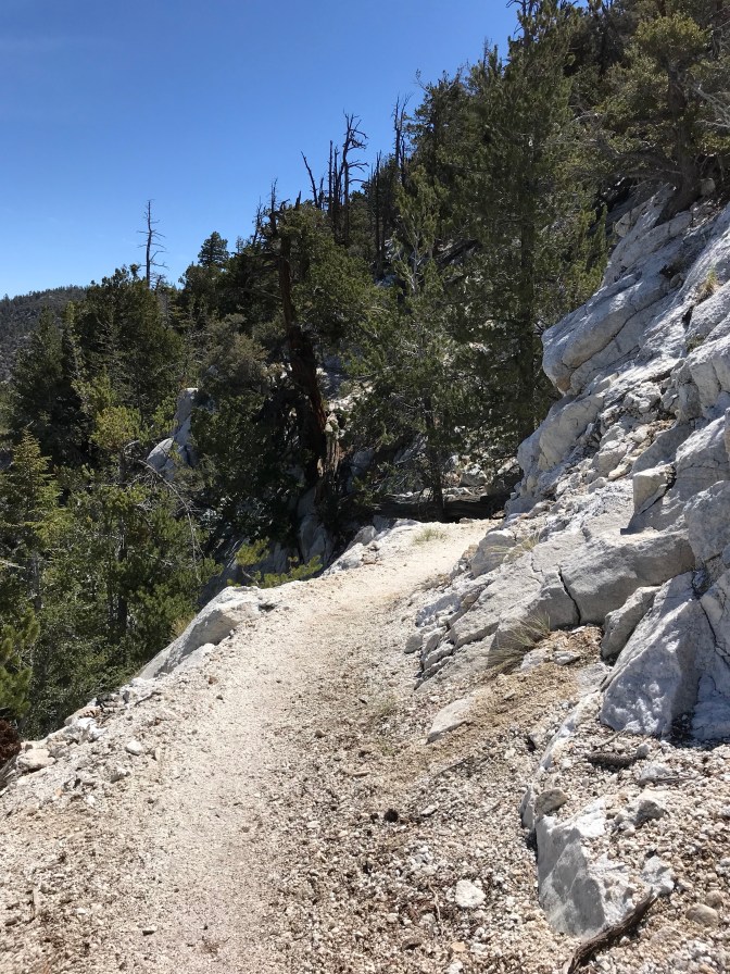 I woke up ready to hit the road. Out of coffee! I ate a bar as I hiked out. As the path crossed a ridge top, I came to the end of the burned area. As usual, a new biome for the day. Less desert, more trees, still plenty hot. Even the geology changed. There was more of it. Great chunks of white quartz lined the trail. My trail runners crunched over white quartz gravel.