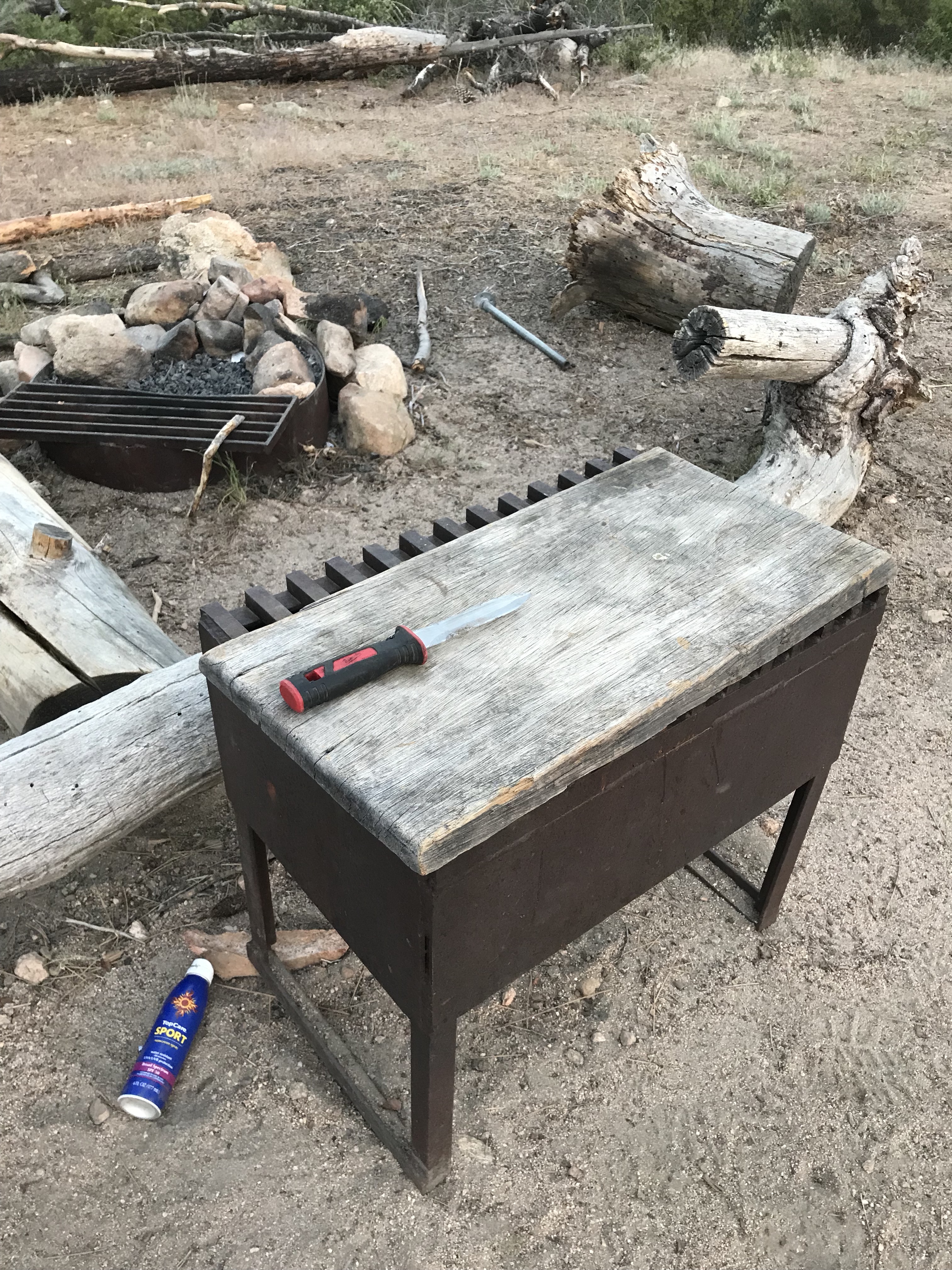 Around nightfall, I met Pumpkin, a baker from Olympia. She’d started her hike back near Whitewater. On her first night, she’d had an encounter with the feral pack of pit bulls. No bites but she was understandably shook by the experience and still nervous at night. We stopped at a streamside spot called Bench Camp. Which had no bench, but there was a fire ring and a grill and a large, lethal knife. Probably just a fishing thing since we were next to the stream, but my mind immediately went to murder. “What if we wake up in the morning and the knife is gone?” I asked Pumpkin.
