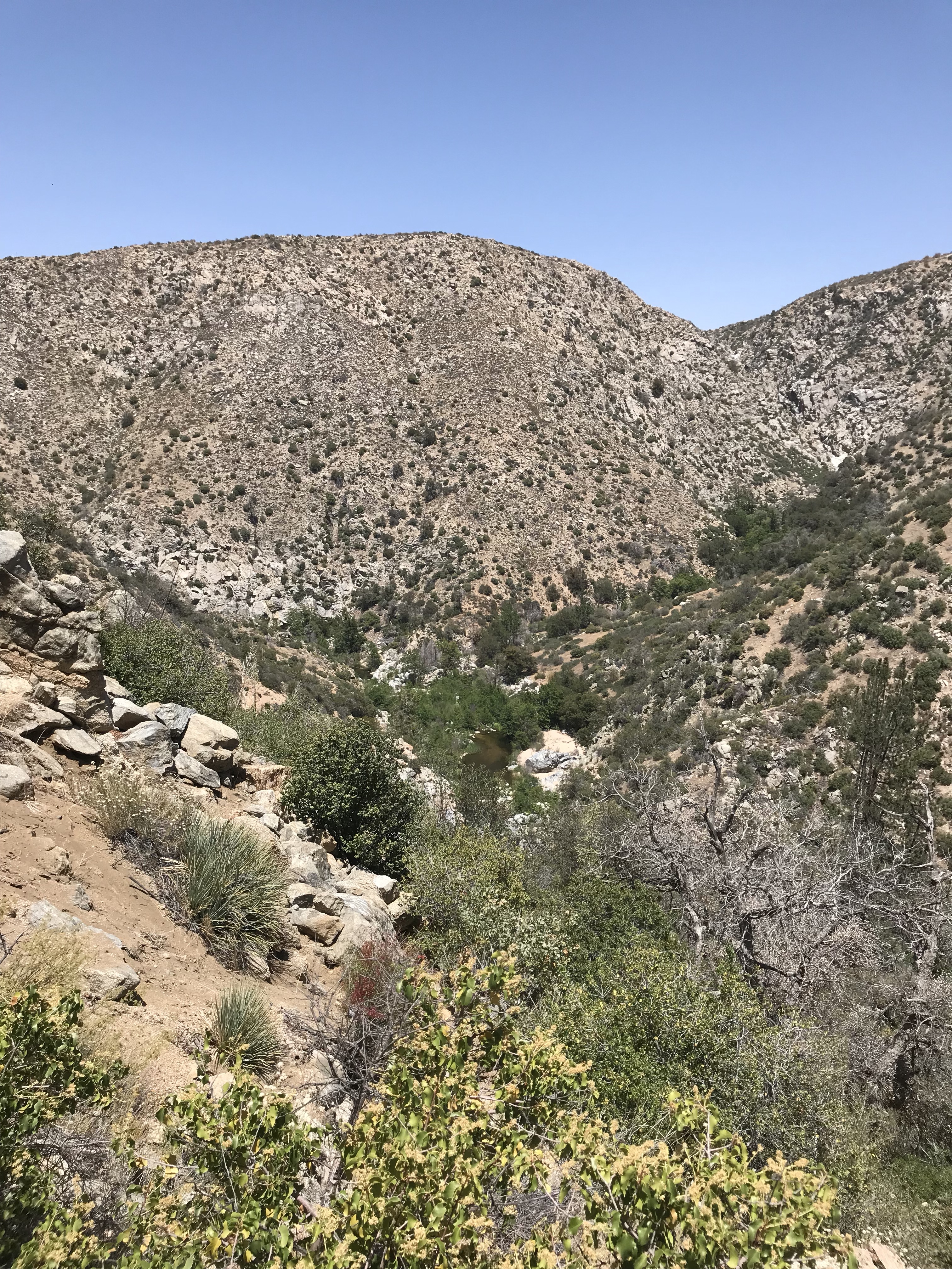 On the map, it looks like the PCT follows Deep Creek all day. So deceptive. Yes, the creek is there but it is deep. It’s in a canyon, an unreachable crevasse that runs parallel to the trail. There are deep green pools lined with reeds and smooth rocks. If you were lucky, you might be able to skid down the cliff faces to reach those pools. You’d need climbing gear to get back out.
