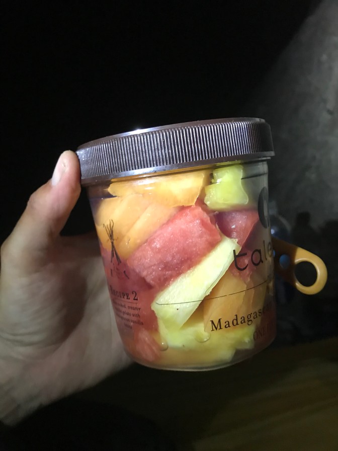 I guess I sat inside McDonald’s for an hour or so. Mostly drinking beverages. I wasn’t very hungry, turns out, just thirsty for bubbley liquids. Next door at the convenience store I bought too much candy. In the parking lot, there was a dude under an umbrella selling cut fruit. I asked him to fill my plastic jar with melon, pineapple, and watermelon.
