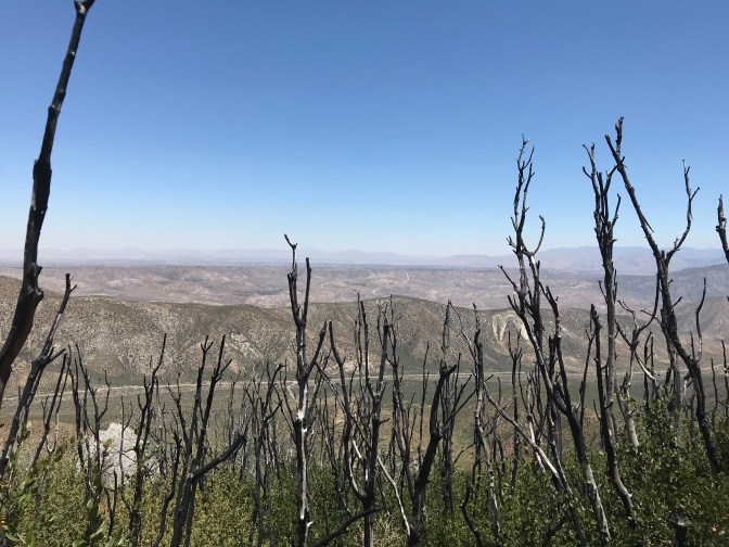 Near the summit, I slumped in a sliver of shade, too tired to even eat. I had policed my water intake all day. There was the turn-off to the Acorn Trail. Two miles downhill and I’d be in town. But would I walk back up or skip a few miles of trail? Neither. I kept walking towards Guffy Campground. I found a nearly dry water cache near the dry springs. There were more full water jugs at the bathrooms and I have never felt so grateful to trail angels.
