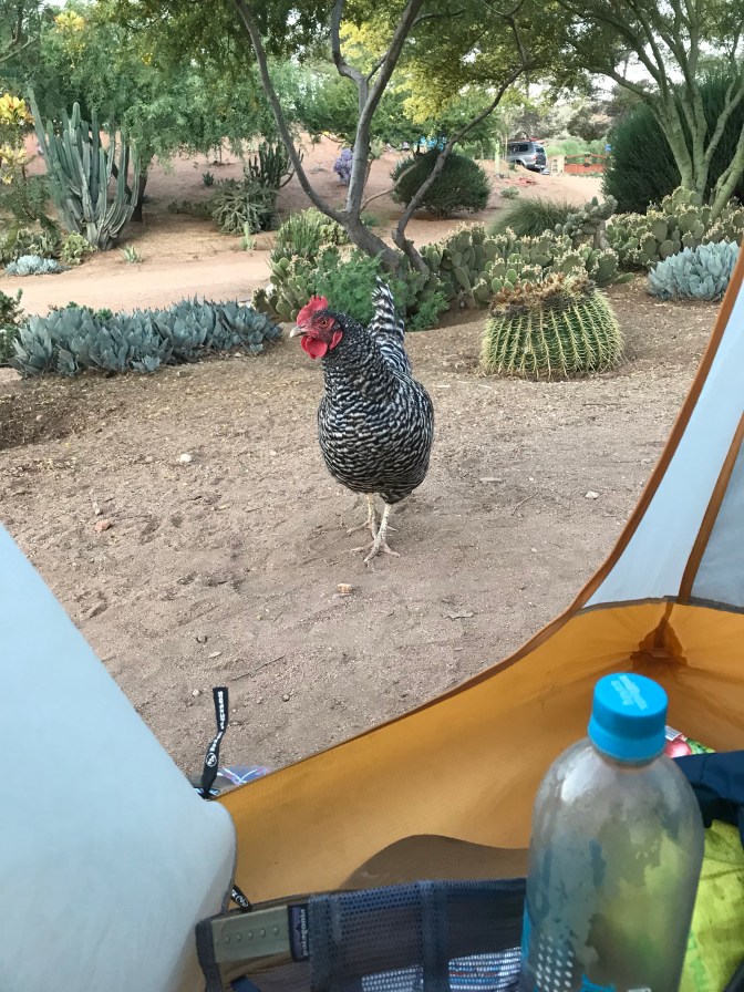 I spent the morning watching dogs and chickens and hikers. Two people were hiking with dogs. The two little ones were handy when the rooster got overly aggressive. I’d meant to leave earlier, but Donna convinced me to stick around. “A caterer is coming by later to serve dinner. You should stay.” I stayed.