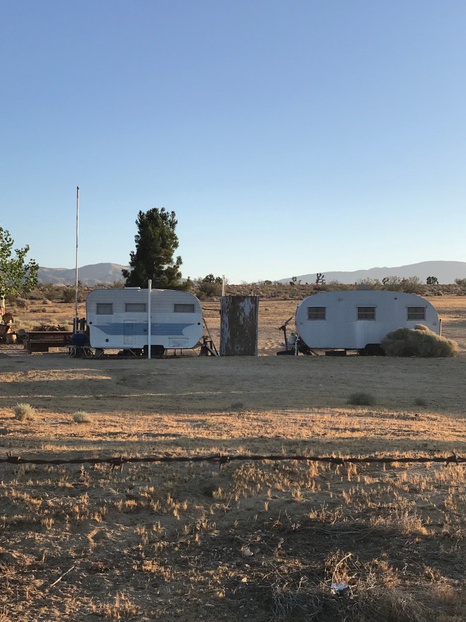 The walk in the morning wasn’t awful. The heat and wind didn’t start up until around 10. The trail followed the dirt road next to the aqueduct. Here and there, random desert settlements. Bandits might live there. A trailer park full of cute trailers. Ooh bathrooms, damn, that fence probably means no.