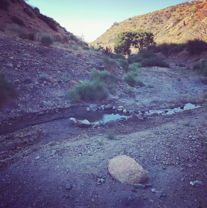 According to the maps, there would be another water source in 6 miles. Much as I wanted to believe this, the possibility of a stream surviving in this heat was seriously unlikely. I loaded myself down and set off at when the air was finally noticeably cooling down. What a lovely surprise for me, to come into a canyon and find a running stream. Super tiny and trickling but real water!