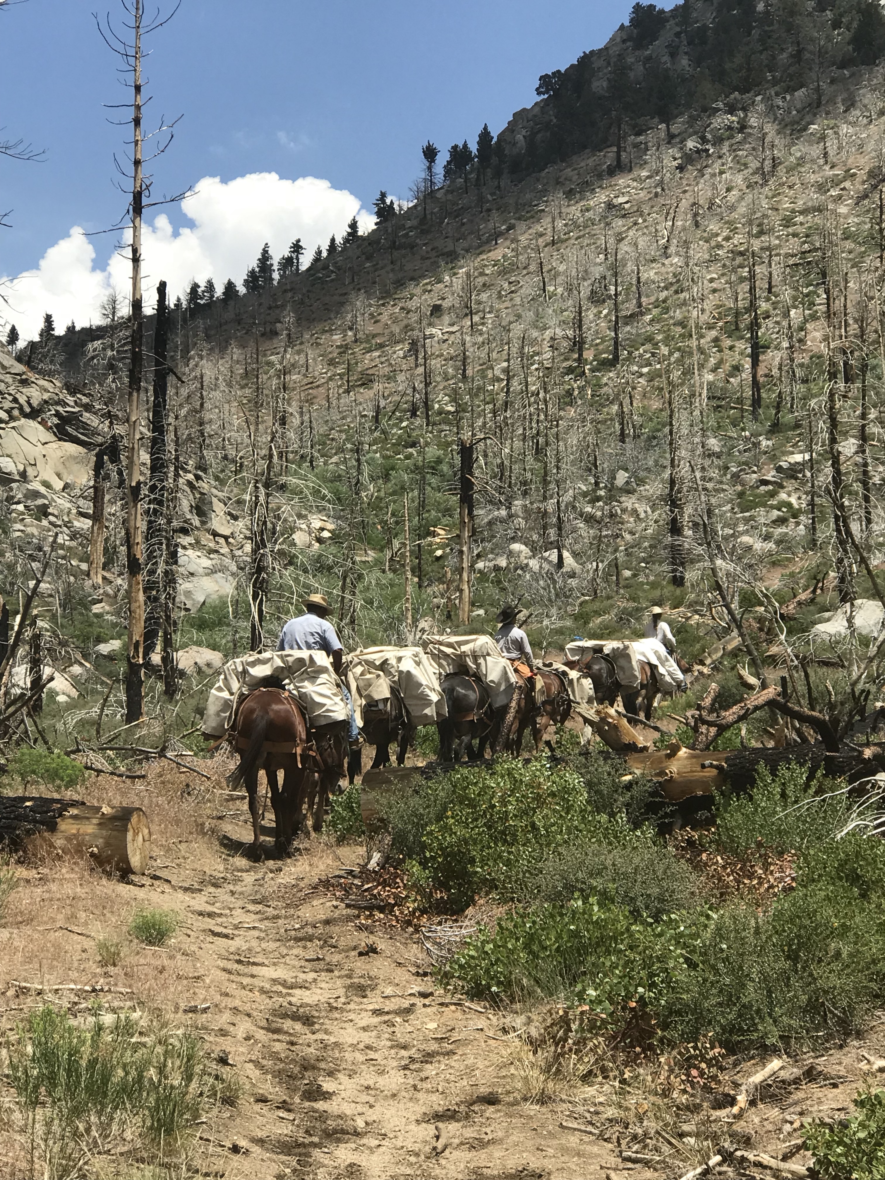 I was stumbling along at my snailish pace when I heard a noise from behind. Turned around to see the mule train! Three riders on horses and 6 or 7 mules. The mules were loaded with large metal boxes. I stepped well aside and watched them all go by. The riders were all ideal outdoor adventure characters. One guy even had a twirled mustache.