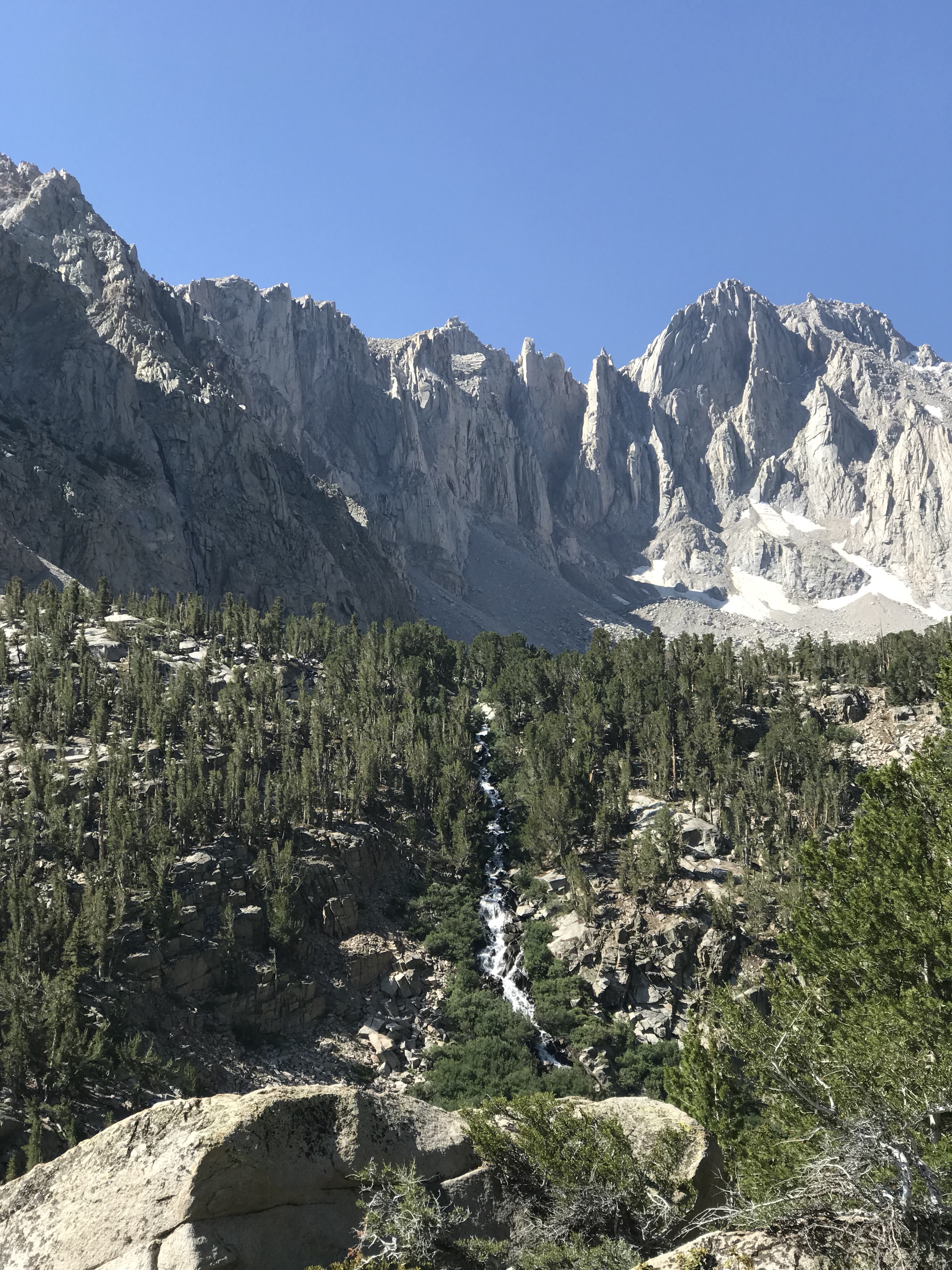The approach to Glen Pass was hard. Really hard and bumpy rocks, too many switchbacks, steep grades. There were lots of aquamarine alpine lakes on the approach and that was pretty. The pass is at nearly 12,000 feet. The sky was solid gray and unfriendly looking. The ridge at the top did not invite hanging out to enjoy the view. Coming down the other side, plenty of adorable animal activity. I caught a picture of a hamster looking thing — maybe a pika? A litter of young marmots rolled and tousled in mock fight. A deer in th bushes scared the shit out of me with its rustling bear impersonation. Water flowed all around grassy green hummocks. The path edged around an impressive cliff above a lake.