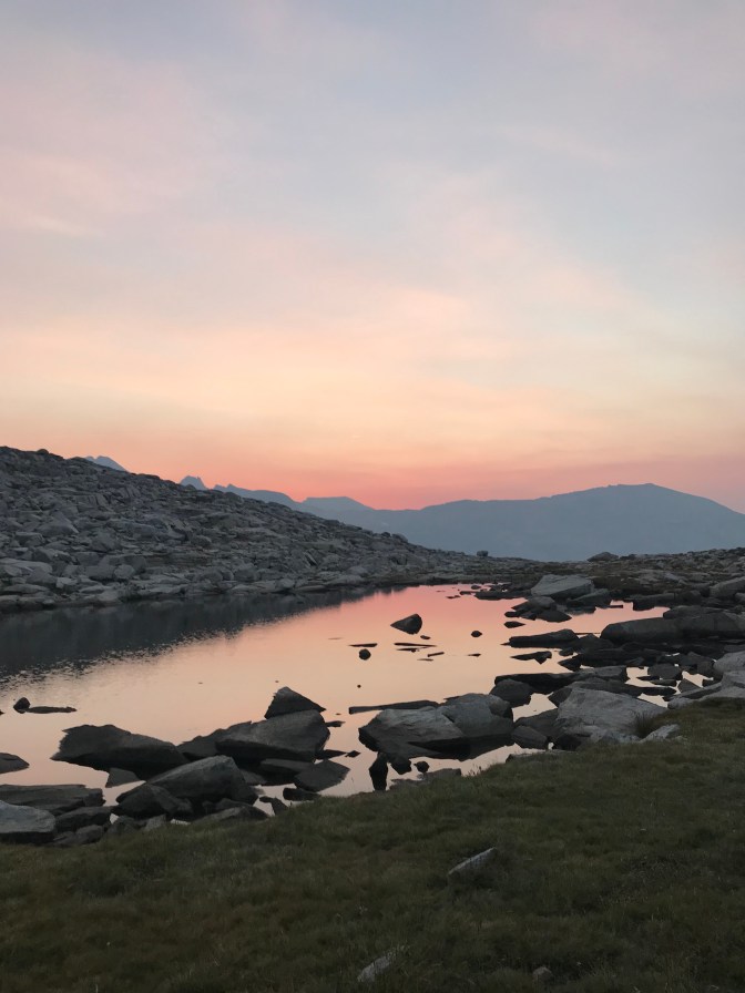 Around sunset I walked over Donahue Pass. A couple of dudes were camped there in their ultralight tents. They were wrapped up in all their puffy gear and they looked cold. As long as I’m dry and walking, I don’t feel cold. But I bet it gets chilly up there at the top. As far as I’m concerned, seeing a sunrise or sunset just isn’t worth a night of shivering.