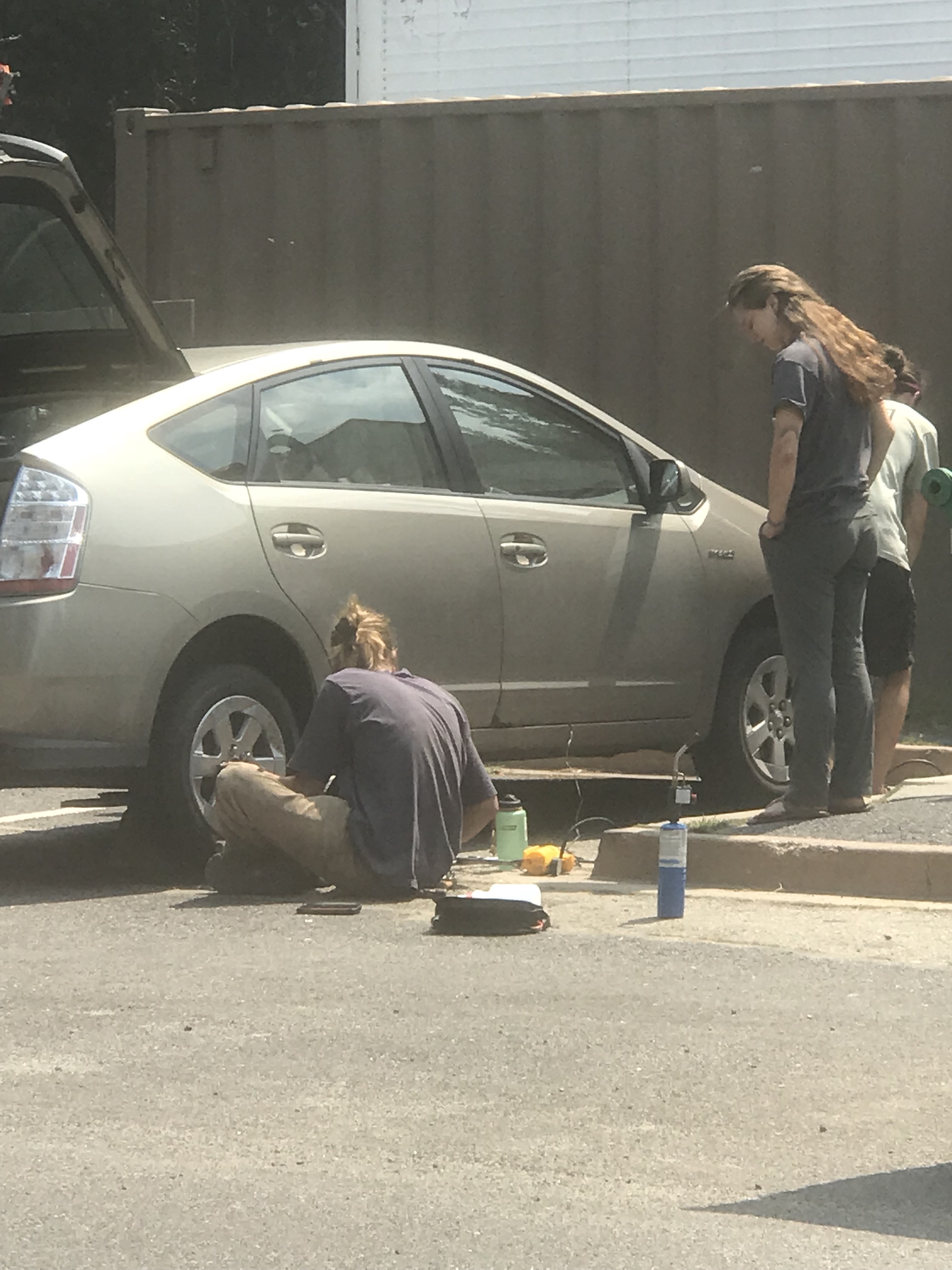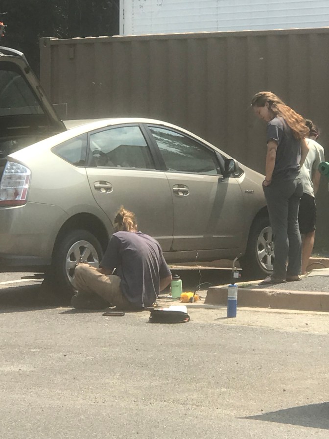 There was a tiny hiker vortex black hole right beside the P.O. Hikers sat at a group of picnic tables, exchanging packets of instant food and secondhand info. I ate a dry-ish cheeseburger and drank coffee and tried to figure out what to do. One lady said if you waited till highway 108 to get off trail at the closure, there would likely be no rides. It wasn’t just the trail closed off, it was the highway as well. You might have to walk out of the mountains along the closed highway. One guy swore he’d hike all the way through, fire be damned. A woman with a phone signal showed me maps and routes. Some hippies worked on their Prius, using a bicycle pump to fill an auto tire. I don’t know what the butane torch was used for.