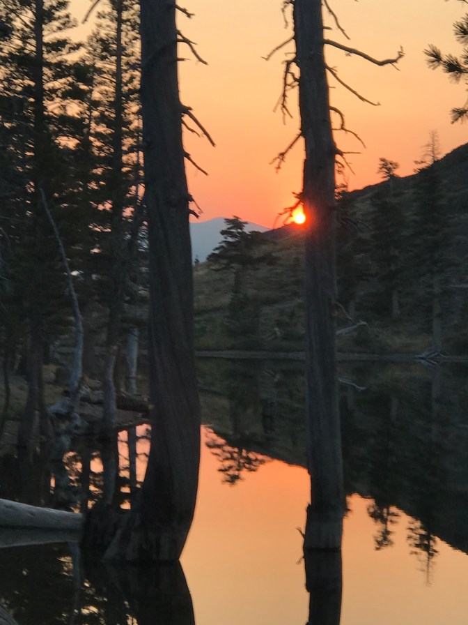 At Carson Pass, the volunteers had cookies and Cokes and snacks for PCT hikers. I sat on the porch and chewed away. There was a cloudy looking cloud coming over, full of thunder and threats. I petted dogs and tried to wait out the rain. If it would just start raining already. That got boring after an hour. I moved my rain gear to a more accessible spot than the very bottom of my pack and kept going. Twenty minutes later, lightning cracked and the rain started to fall. I got into my plastic clothes and kept hiking. For the next two hours, I met drenched day hikers. Some of them were turning blue. The dogs were super excited about walking in the rain. The people looked like they were going to get into the car, crank the heater, and never go hiking again.