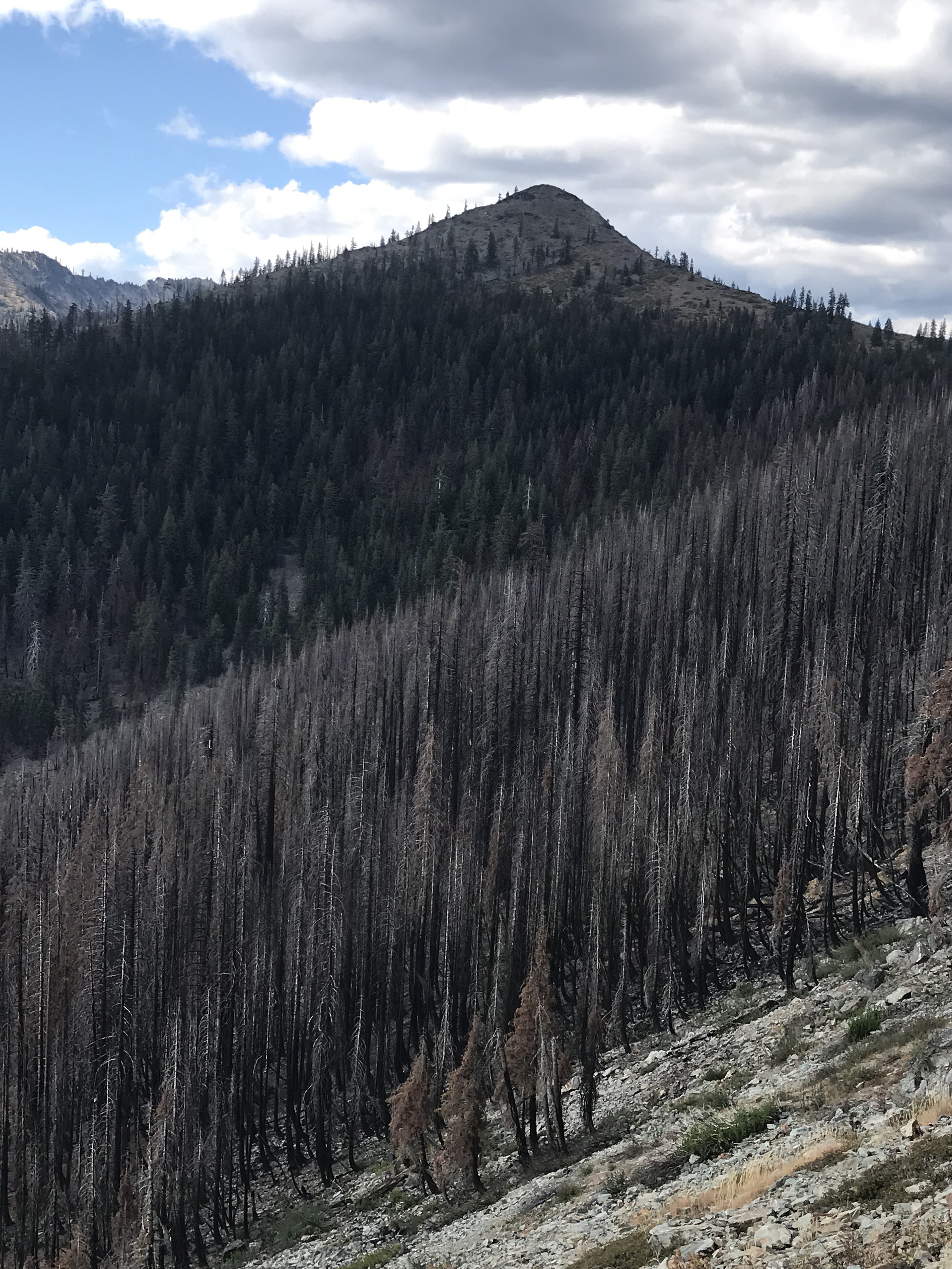 I walked through miles of old burn. When did this happen? It’s not all blackened. I can see it in waves up the hillside, forming stripes of green and black.