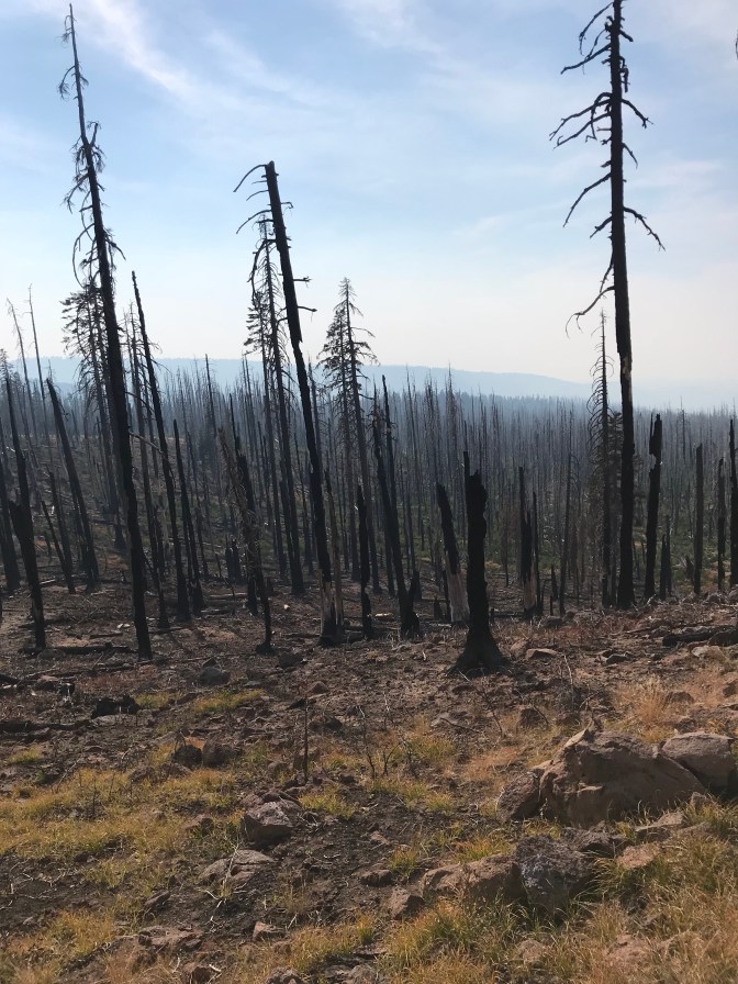 It’s a pretty forest today, little Xmas-sized trees and delicate shrubs in fall foliage. Then I got to the burn area. It was closed until recently. You can see where the trail crews moved the fallen trees or cut through burnt logs. Some of the standing trees look like skinny stacks of charcoal briquettes, balanced precariously, waiting for just the right gust of wind to topple over. The ground was moon dust and ash in some places. In other sections, the baby trees flourished in their nursery, green and fuzzy.