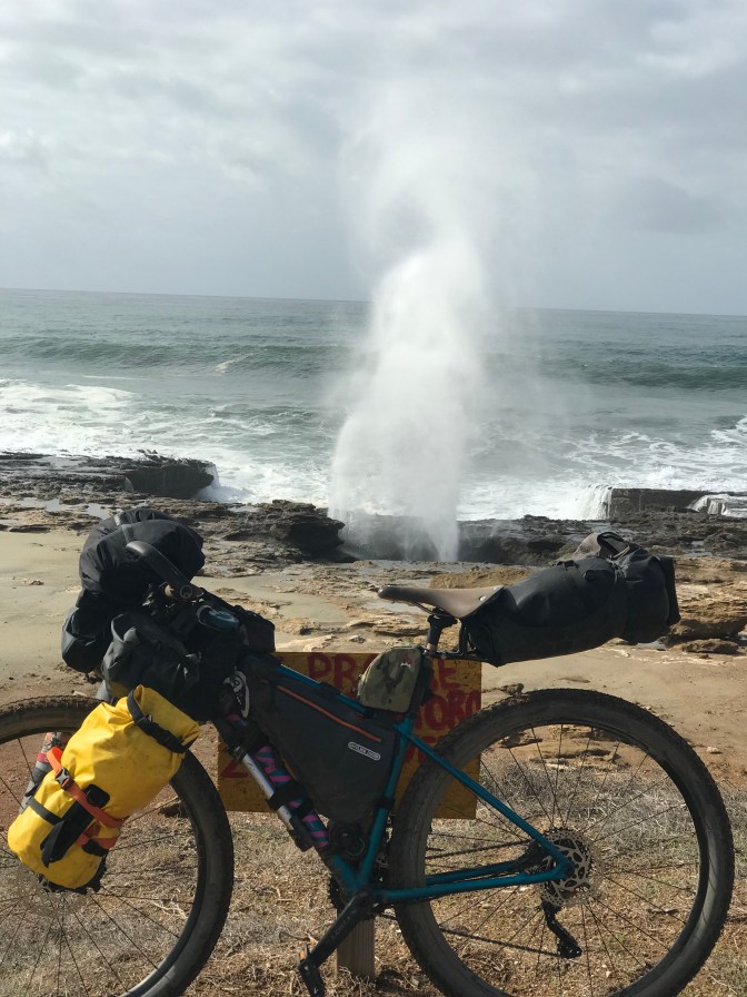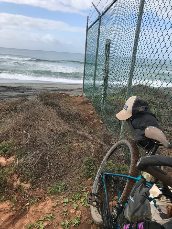 Kind of hard to leave my chilly hotel box after two nights. All my stuff had somehow exploded all over the room. Also I was out of alcohol for my stove, so no coffee. I stopped at a breakfast diner for some eggs and beans. The route out of town left the highway to cross a sandy river bed. I pedaled to another little settlement of houses called Malibu South. The beach was a little closer, not at the bottom of a cliff. Maybe people surf here but I didn’t see any surfers. At one house I saw a herd of sticker covered touring motorcycles inside the gate. A white guy on a dune buggy stopped to watch me struggle up a bumpy little hill. Then he told me, “Hey, there’s a fence across the road up there. You’ll have to flip your bike around the end of it, but I’m sure you can handle that.”