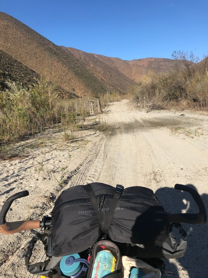 The hills were getting gnarly and mostly I stopped trying to ride uphill. I walked and pushed. Some downhills too. I was getting worn out and my camping choices were sparse. I decided to make an exception to my usual practice of being super hidden from the road. With all the crazy rutted out roads I’d traveled, there wasn’t going to be any night traffic. I found a sandy spot at a turnout. It was plenty windy so I did my best to stake out the tent. I had to get up twice to redo my stakes. Even so, the tent walls blew down on me a couple times in the night. I guess if I hadn’t lived through many a night in this tent in similar conditions, I might have been worried. But I wasn’t cold or wet, and my tent would be okay. At least the wind will dry my shoes.