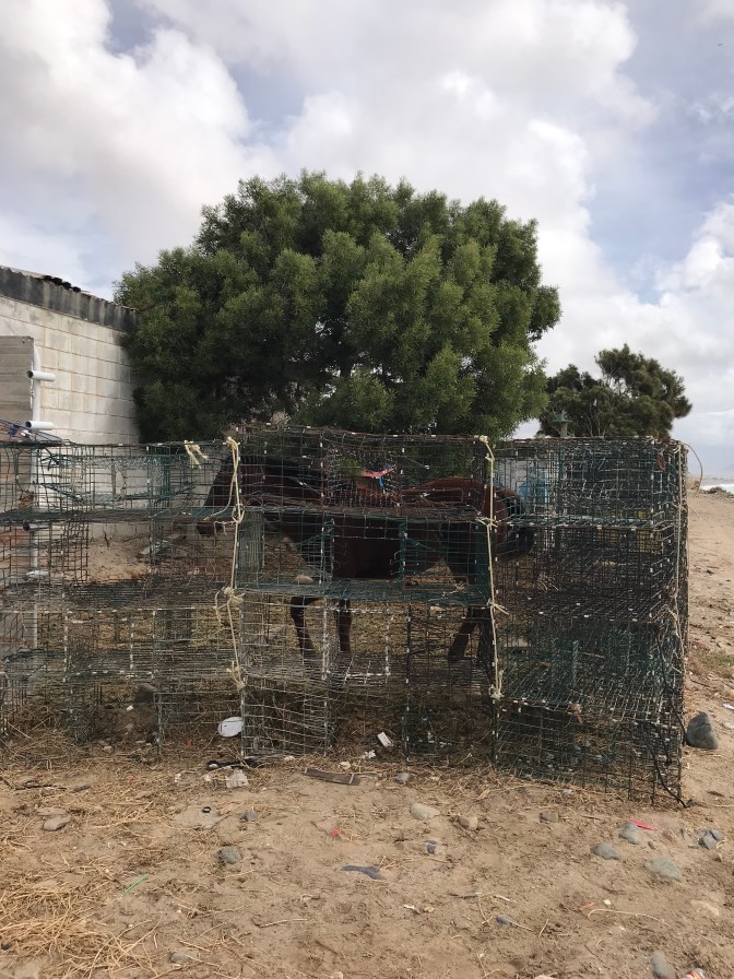 I started out of town with too much food, as usual. Lots of fishing stuff right at the shore, also a young horse in a corral made of lobster traps.