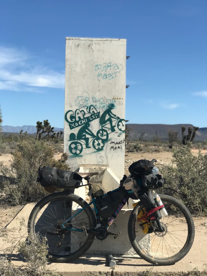I took off towards the hills. The dirt road was well marked and level. Kind of easy. I kept waiting for it to get harder. It was a stunning day. I changed into my shorts. Took a break for snacks. Stopped for photos next to bike graffiti.