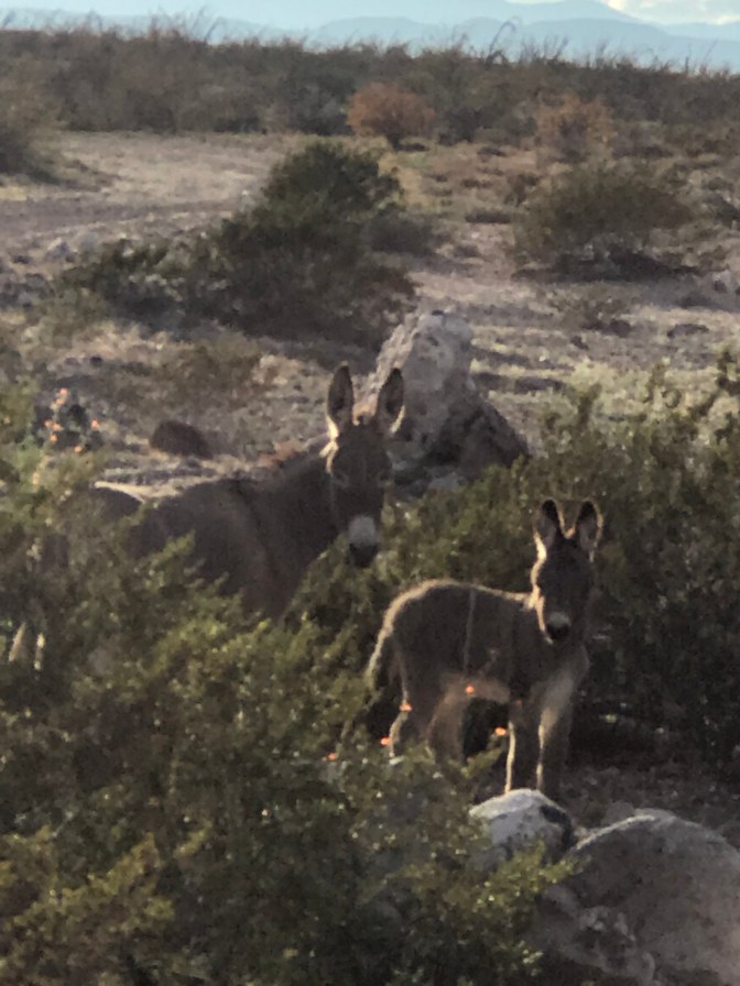 I saw another herd of wild donkeys. All gray with white bellies. The baby was especially cute. It did all this wild kicking when it ran. I wonder if they’re really wild or if the ranchers let them forage and then go catch them when they need a donkey. But I don’t know, those donkeys don’t look like they’d want anything to do with donkey work. That baby donkey for sure would kick off anything you tried to put on its back.