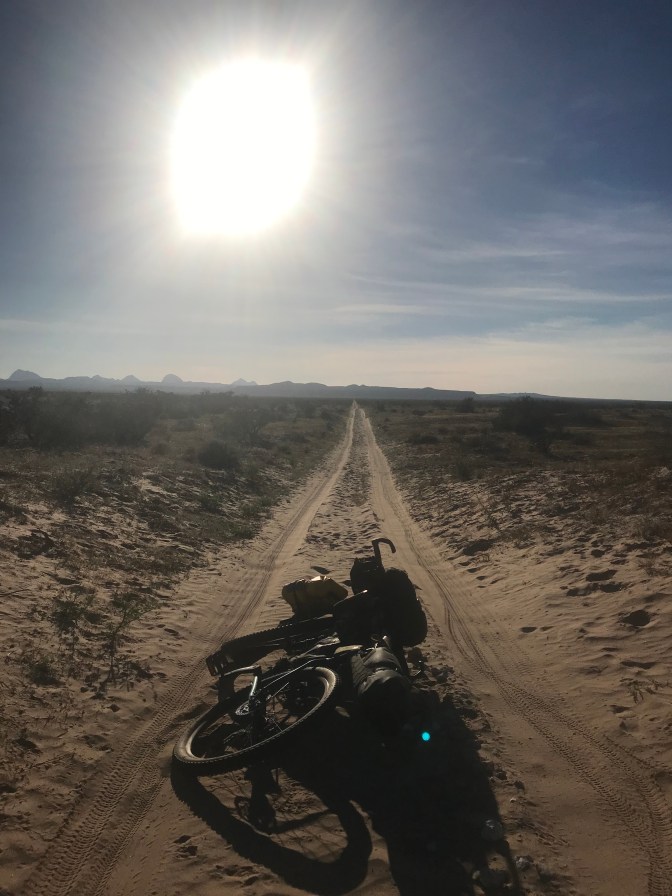For a minute I was on the highway. Then the route turned. Into sand. Deep sand. It sucked at my wheels like a vacuum. Also there were huge prickle burrs that leapt onto my shoes. Pulling them off poked holes into fingers.